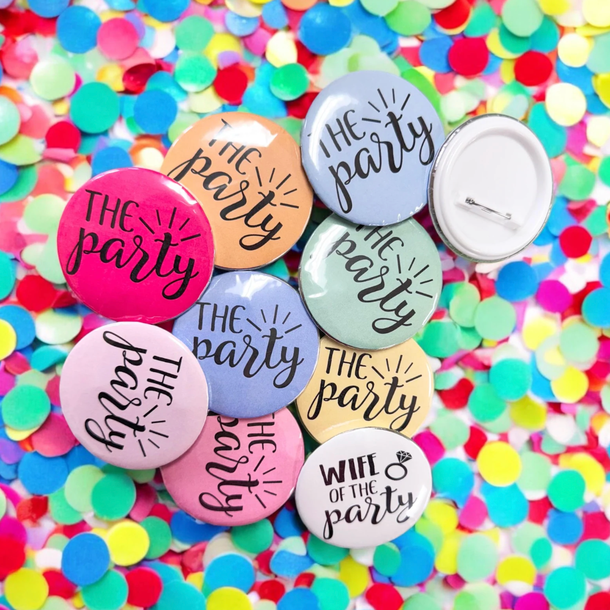 Check out our pin back buttons. We have multiple different designs available. These will make the perfect accessory for birthday party or bachelorette party!