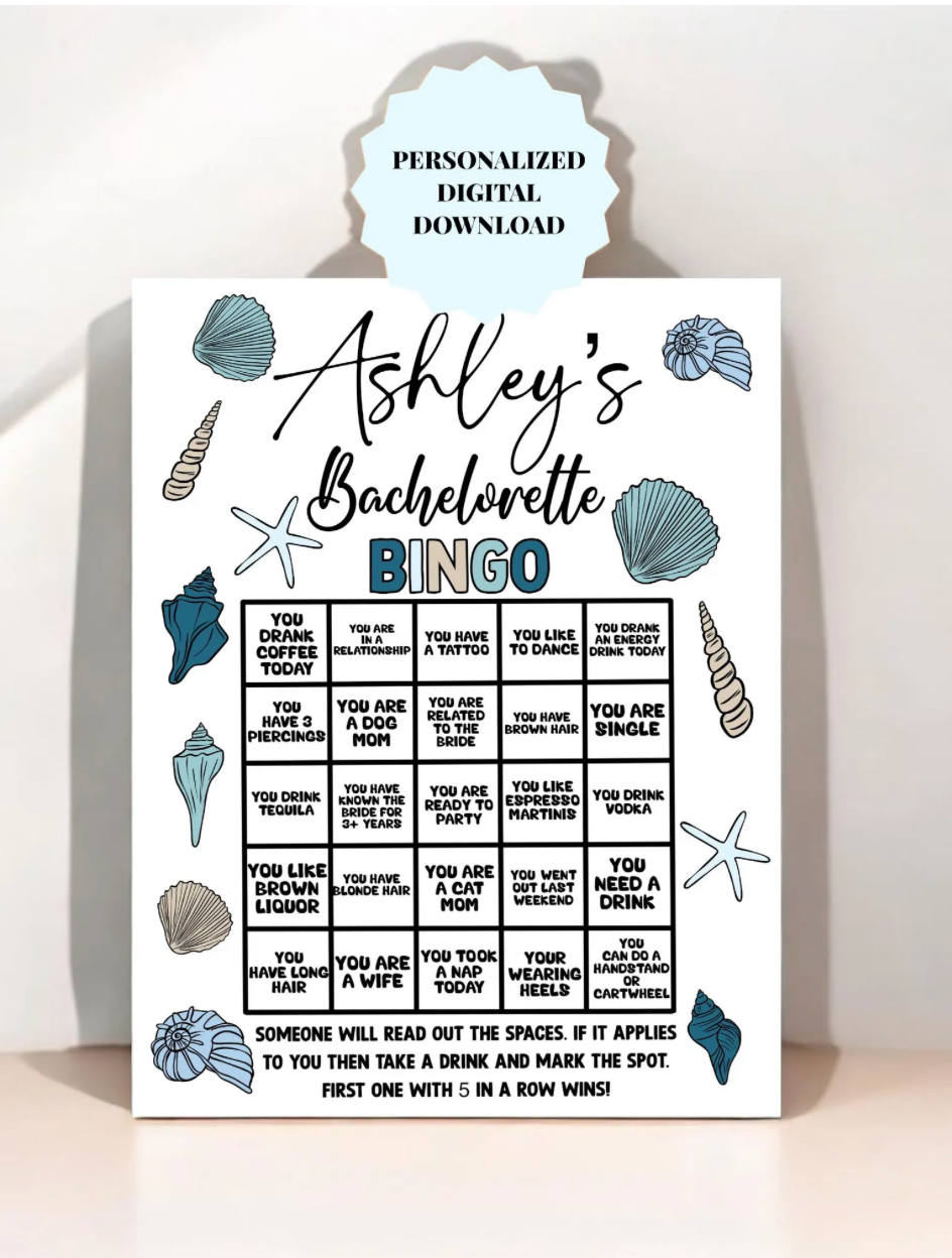 Check out our party game downloads. Simply enter the personalization you would like at checkout and we will customize it and upload the file for you to download and print as many as you would like for your event.