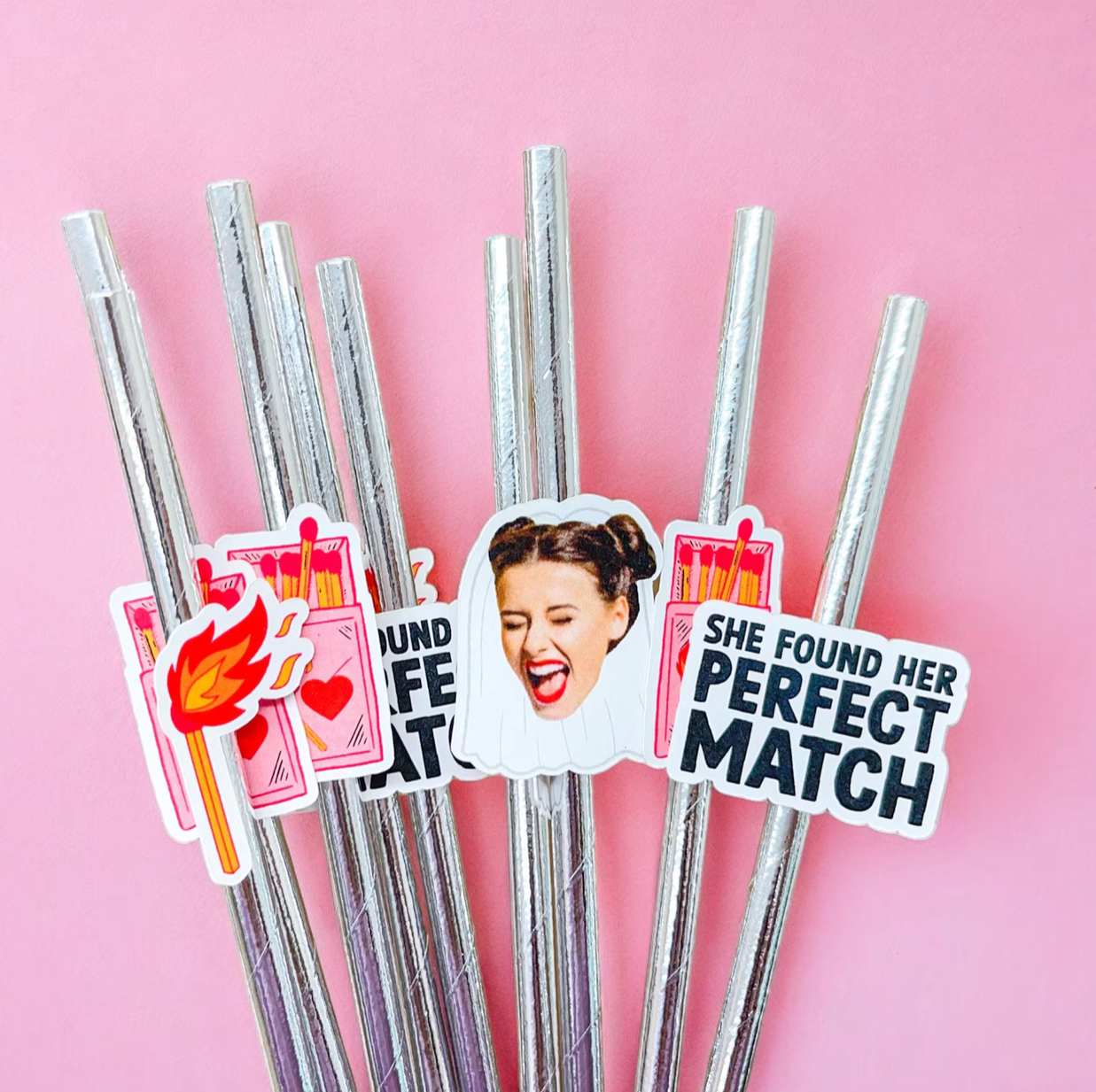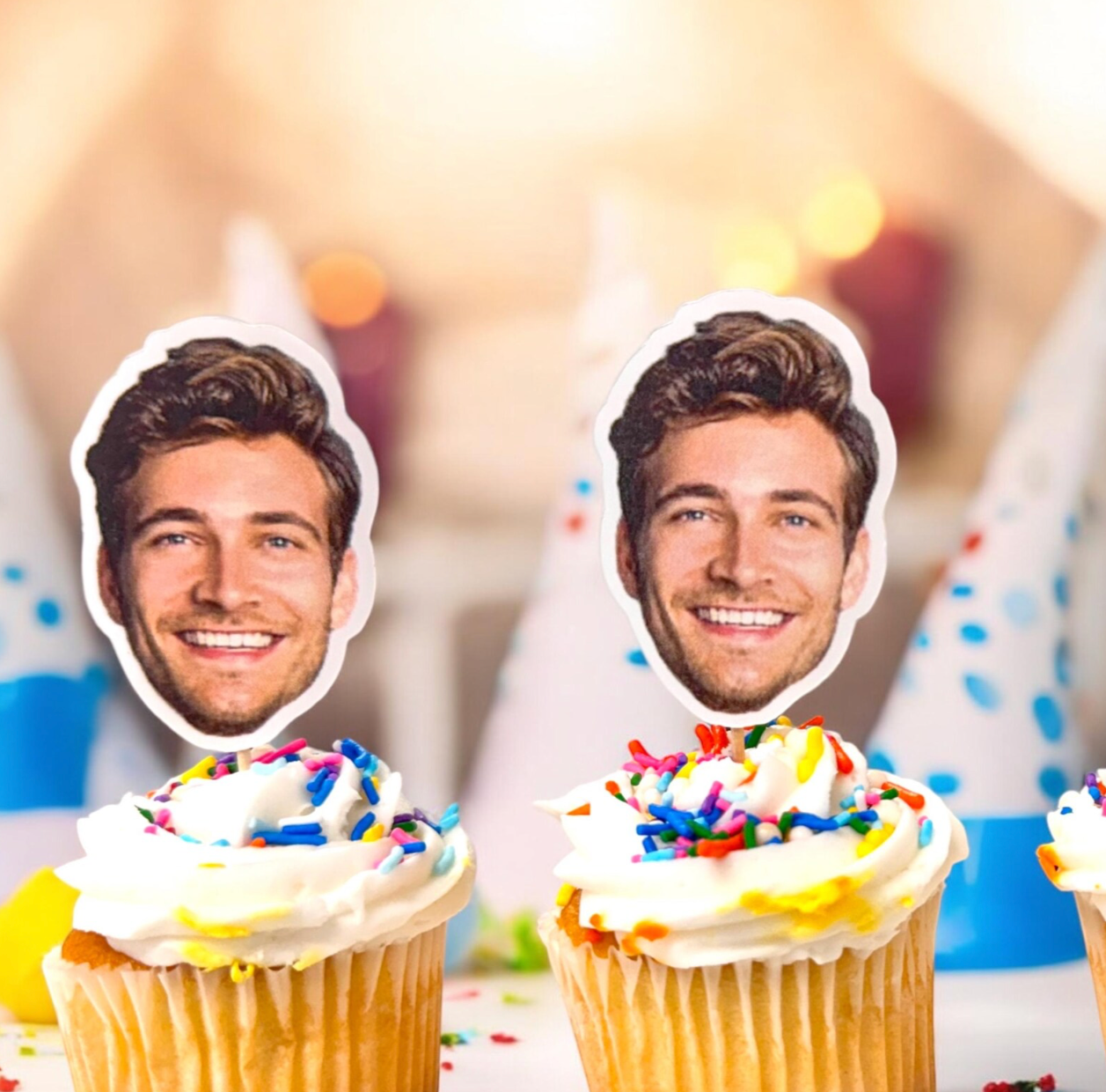 Check out our paper party straws. These can be personalized with your photo. They make a fun accessory for your party guest to grab and add to their drinks.