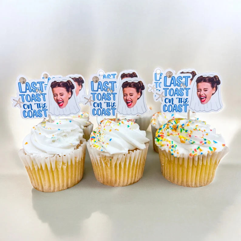 Welcome! We are so excited to have you here. This listing you are looking at is for our last toast on the coast themed toppers. These toppers are 2.5 inches. This is the perfect size for cupcakes. We have also seen customers add them to different food items as well. We will customize these toppers with the face that you send over. Please upload the photo you would like us to use by selecting the upload photo tab. You can send multiple photos if you would like, and we will help select the best one!